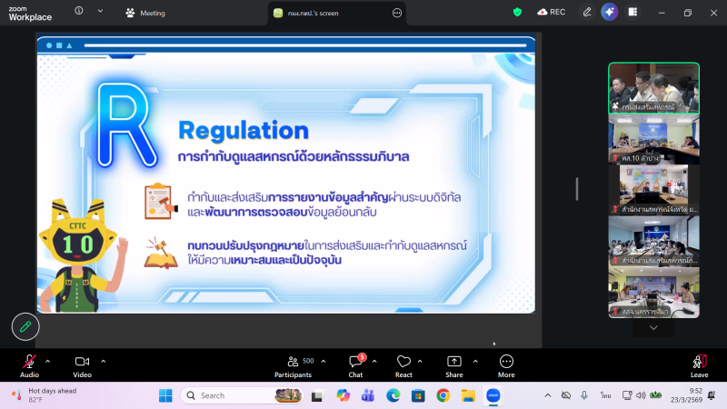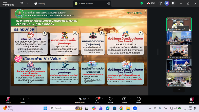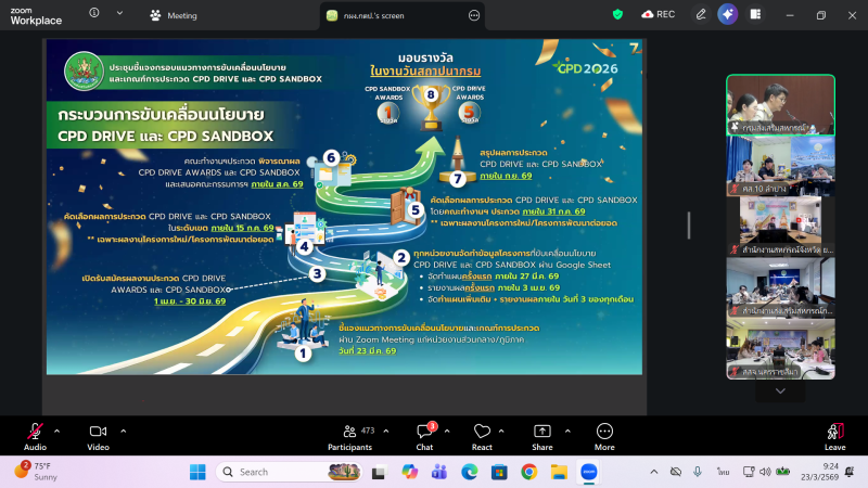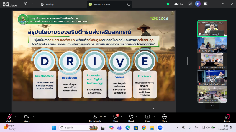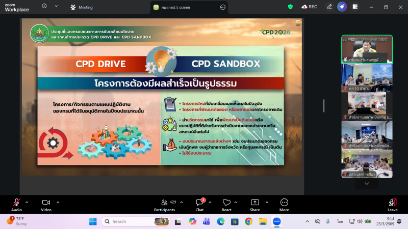 23 มีนาคม 2569 นางสาวอมรรัตน์ คำเวียงสา ผู้อำนวยการศูนย์ถ่ายทอดเทคโนโลยีการสหกรณ์ที่ 10 จังหวัดลำปาง พร้อมด้วยทีมงานศูนย์ฯ เข้าร่วมการประชุมชี้แจงกรอบแนวทางการขับเคลื่อนนโยบาย และเกณฑ์การประกวด CPD DRIVE และ CPD SANDBOX ประจำปีงบประมาณ พ.ศ. 2569 ผ่านระบบ Zoom Meeting โดยมีนายณฤทธิ์ บุญชัย รองอธิบดีกรมส่งเสริมสหกรณ์ เป็นประธานการประชุม ณ ห้องประชุมบัวบงกช ศูนย์ถ่ายทอดเทคโนโลยีการสหกรณ์ที่ 10 จังหวัดลำปาง อำเภอเมืองลำปาง จังหวัดลำปาง